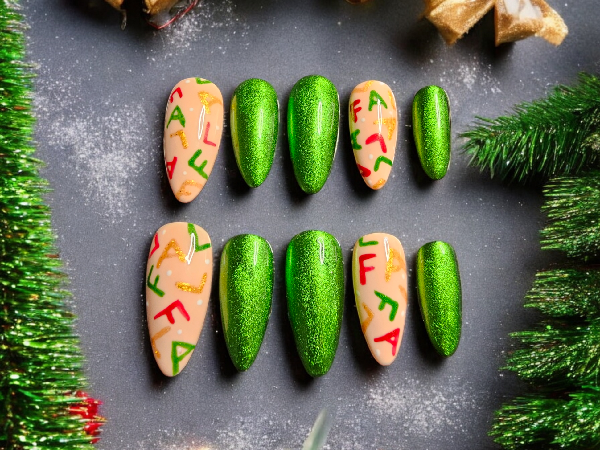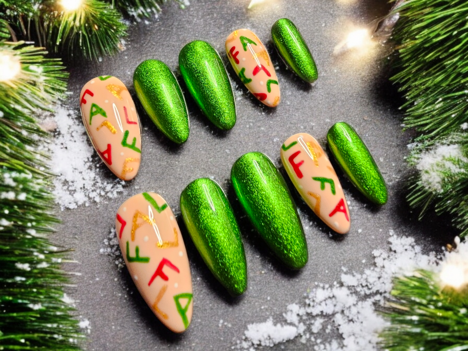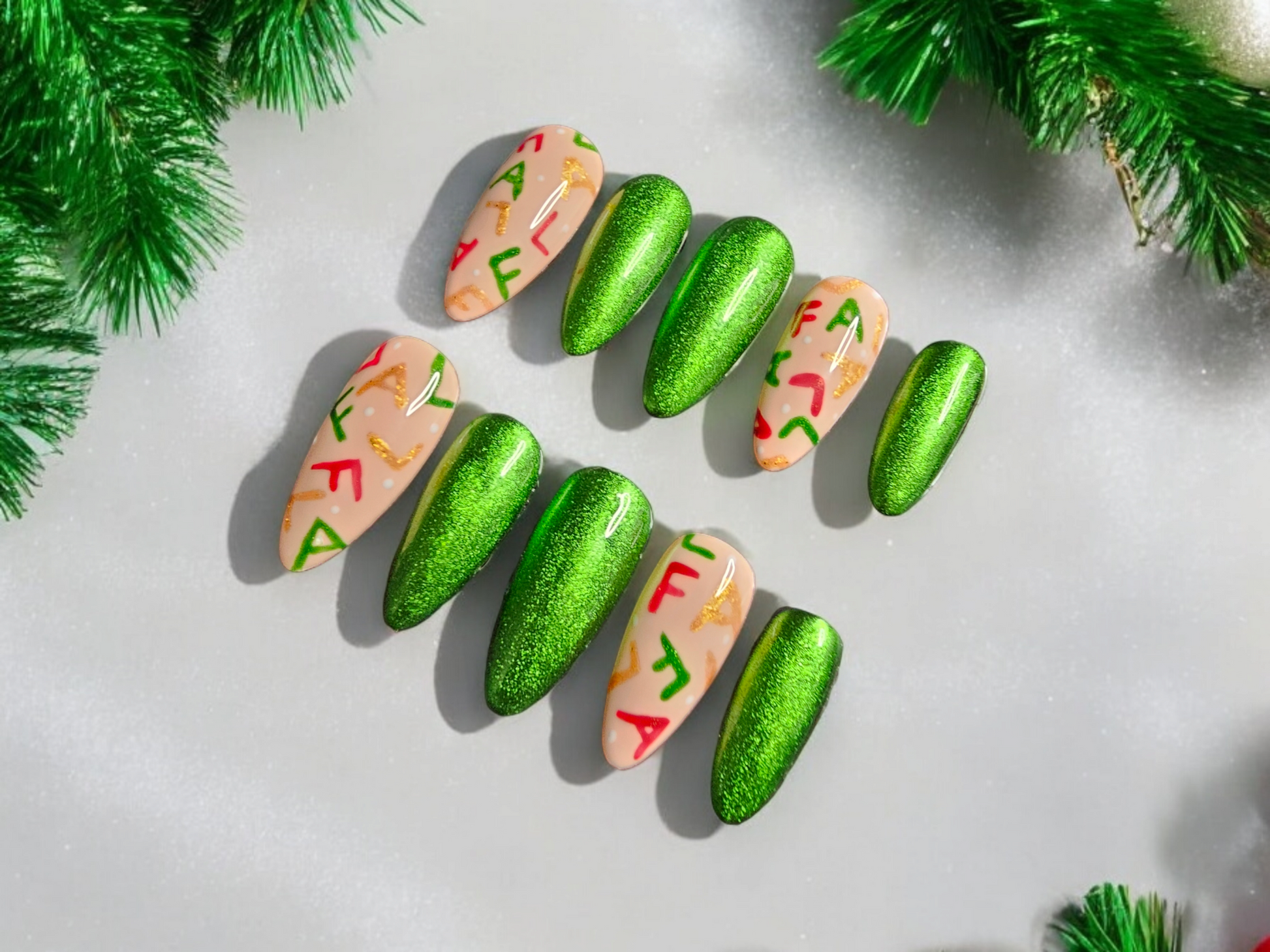 Fa-la-la-La Fabulous Holiday Nails — your fingertips just joined the carol choir. These press-ons are drenched in a rich holiday green shimmer and feature dazzling accent nails that literally sing FaLaLaLaLa in red and gold. With their sleek almond shape and high-gloss finish, they deliver major festive energy without the trip to the salon. Perfect for cozy cocoa nights or sparkling through your TikTok feed, this limited drop is pure merry magic.