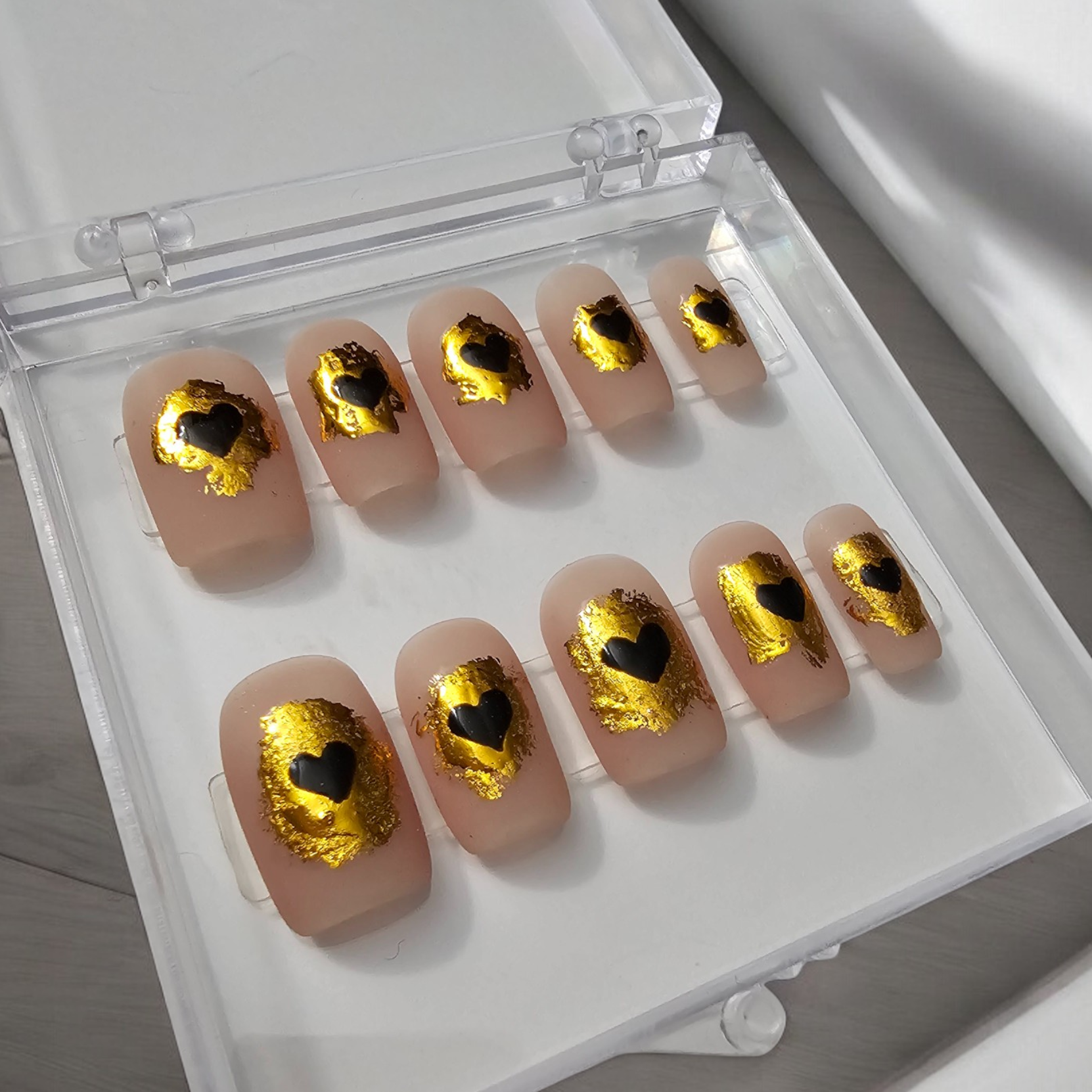 These chic nails feature a sophisticated design with delicate black hearts and gold foil, perfect for adding a touch of glamour to any outfit. These golden press-on nails make an excellent gift for friends, family, or yourself. Whether for a birthday, holiday, or just because, they're sure to impress!