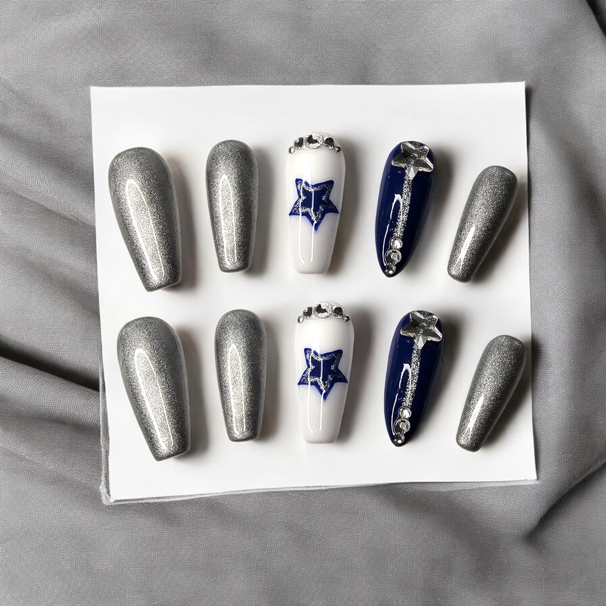 Touchdown-worthy nails for the bold and the beautiful! This set brings Texas-sized flair with rich blue, crisp white, and sparkling silver press-ons topped with rhinestones and star accents. Inspired by iconic Lone Star swagger, these nails are perfect for cheering on your favorite team without stepping into trademark territory.