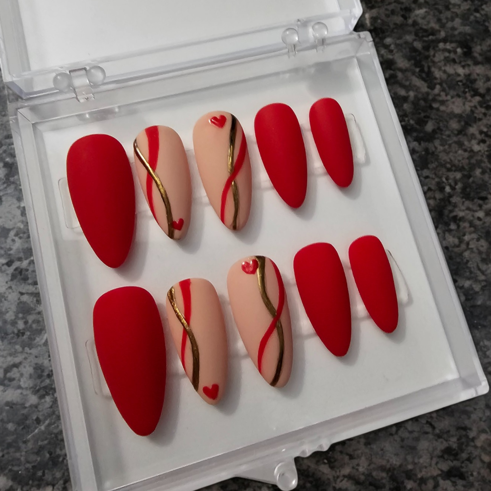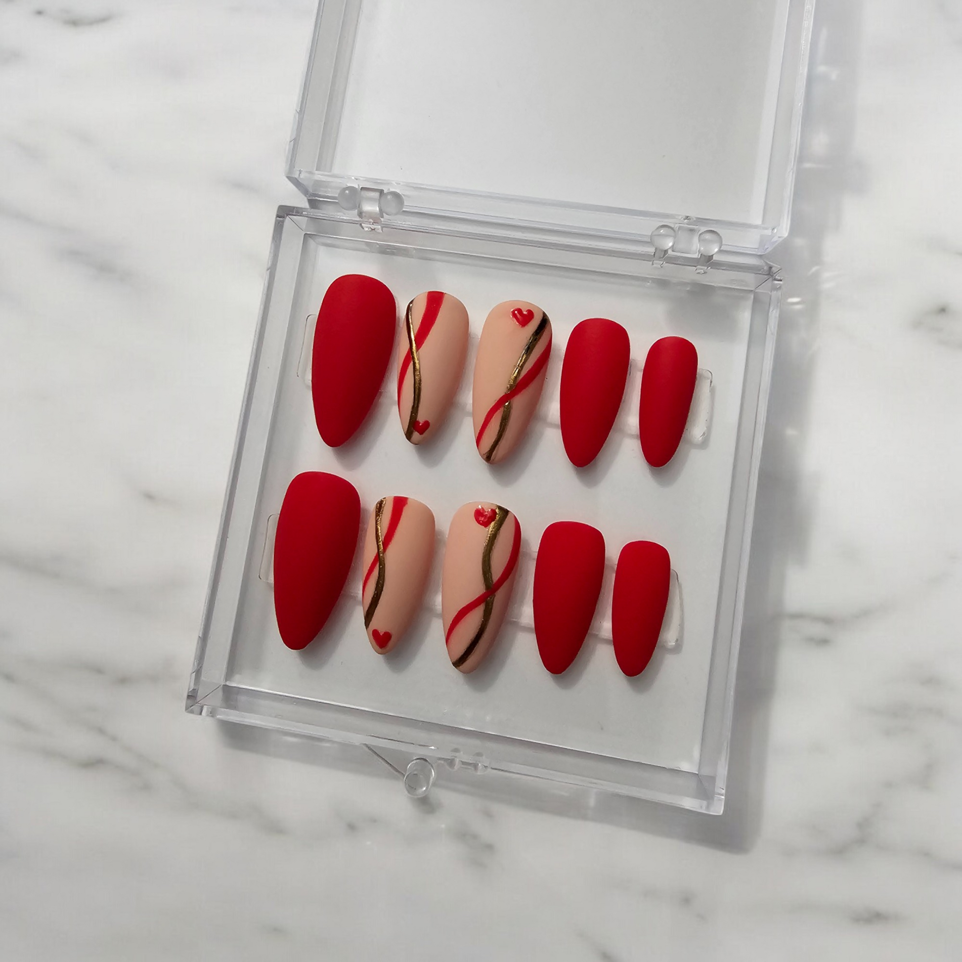 Sweet meets bold in this glossy red press-on set kissed with golden swirls and dainty little hearts that sparkle with flirty charm. It’s the kind of design that says “I woke up like this” with a wink, delivering instant glam with zero effort. Perfect for date nights, main character moments, or just flexing your mood in mirror selfies. These nails channel all the Auntie Cookie’s confidence—playful, polished, and totally crush-worthy.
