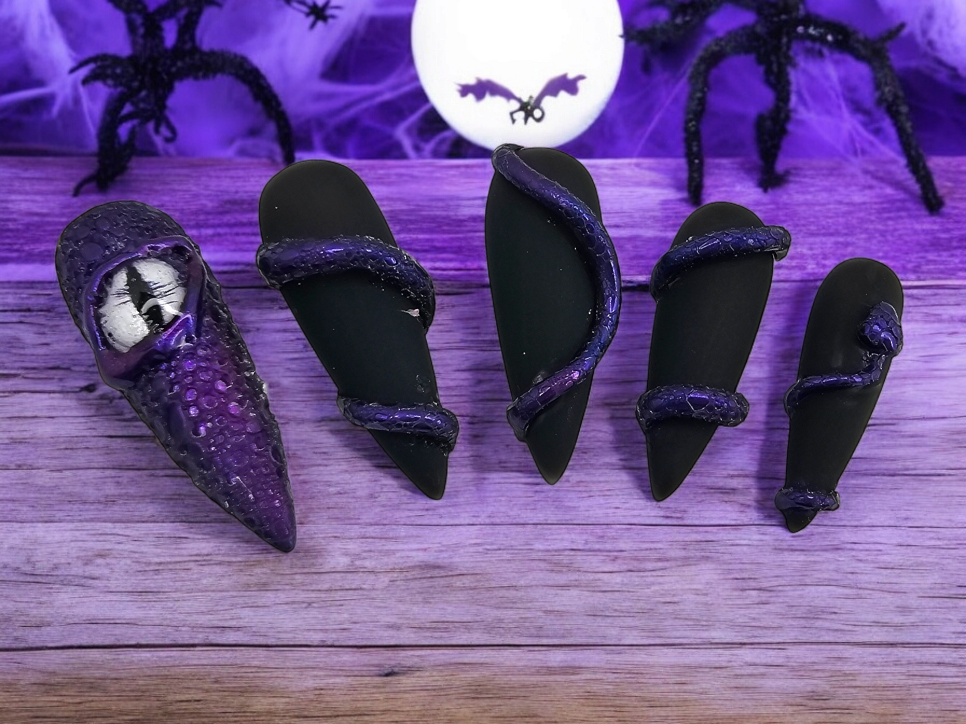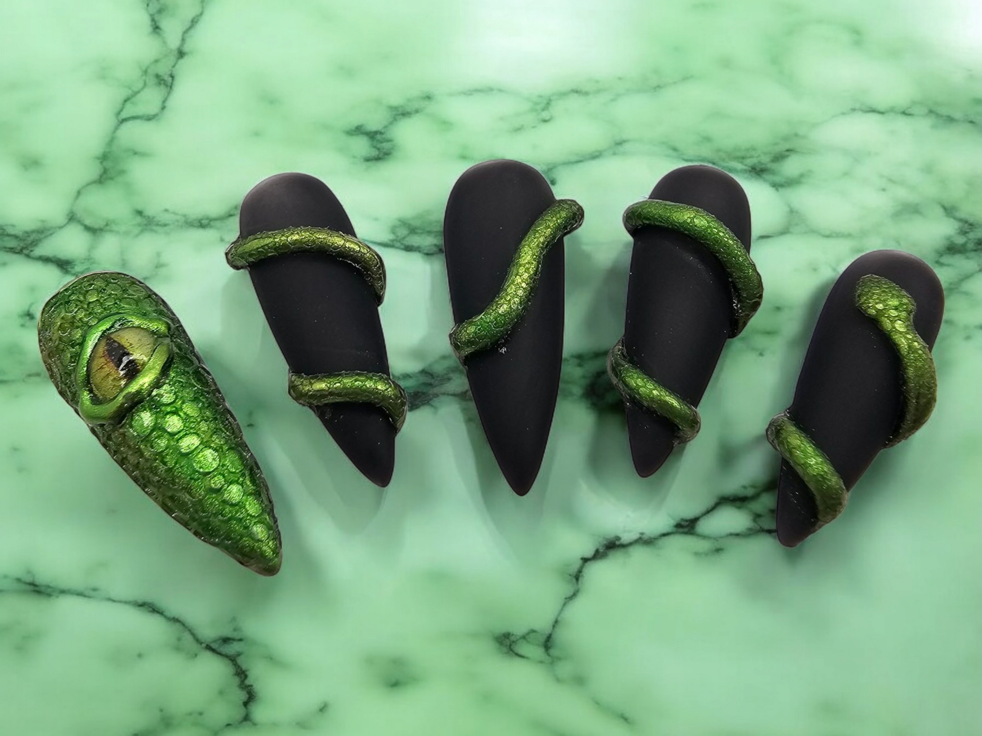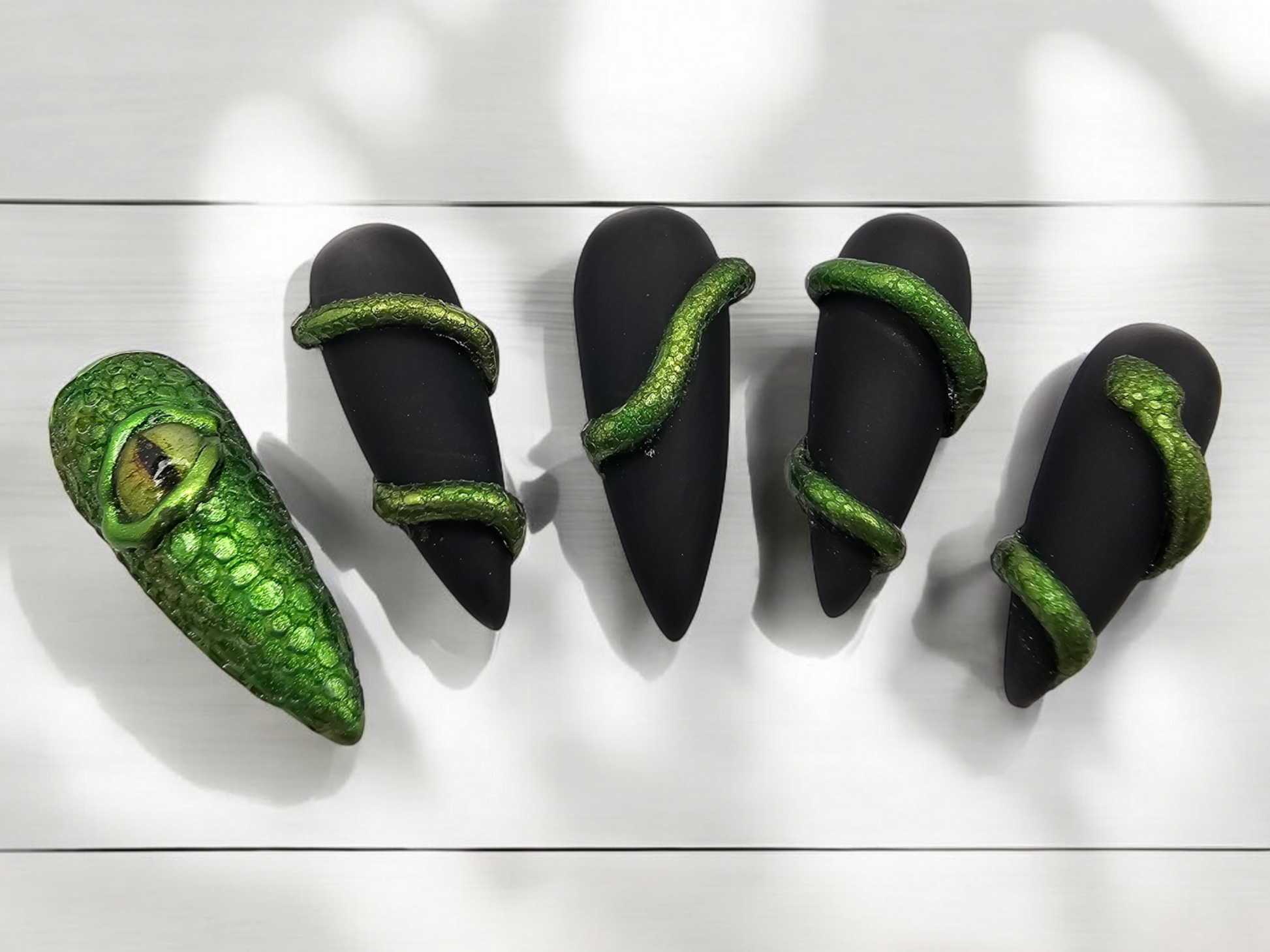 Transform your nails into a dazzling dragon’s claws with these Fantasy-Inspired 3D Claws. Featuring shimmering green chrome finishes and intricate dragon tail details, they add a bold, mythical flair to your style. Perfect for anyone ready to playfully channel their inner dragon and stand out with fierce, eye-catching nails.