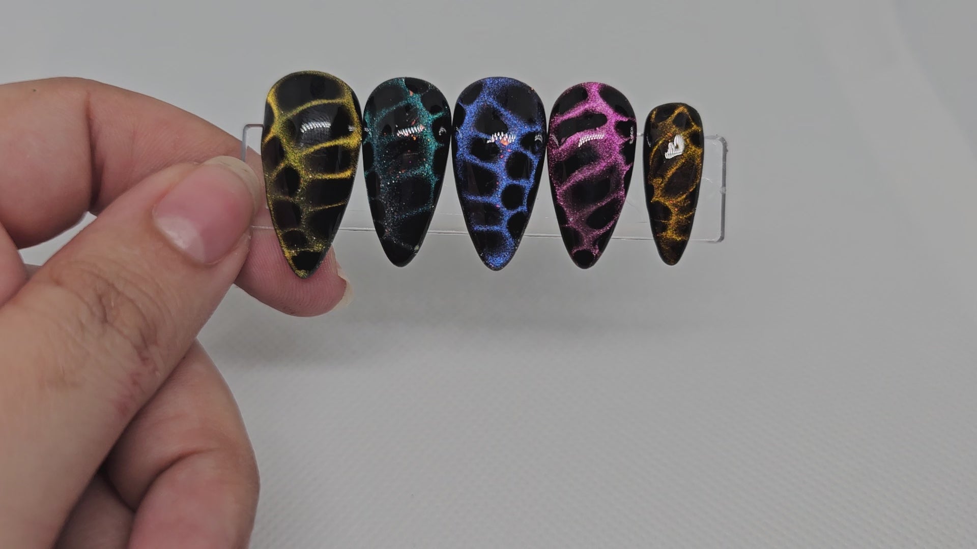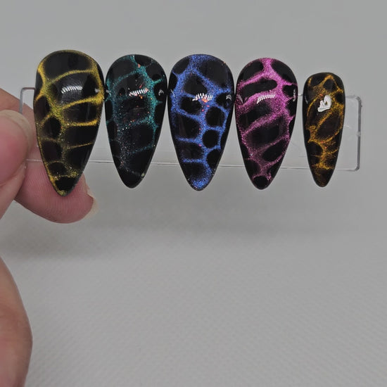 Each nail is handcrafted with a glossy finish and shimmering chrome pigments that catch the light from every angle. Whether you’re dressing up for a night out or making a bold statement on your feed, these nails bring drama, elegance, and a touch of the wild.