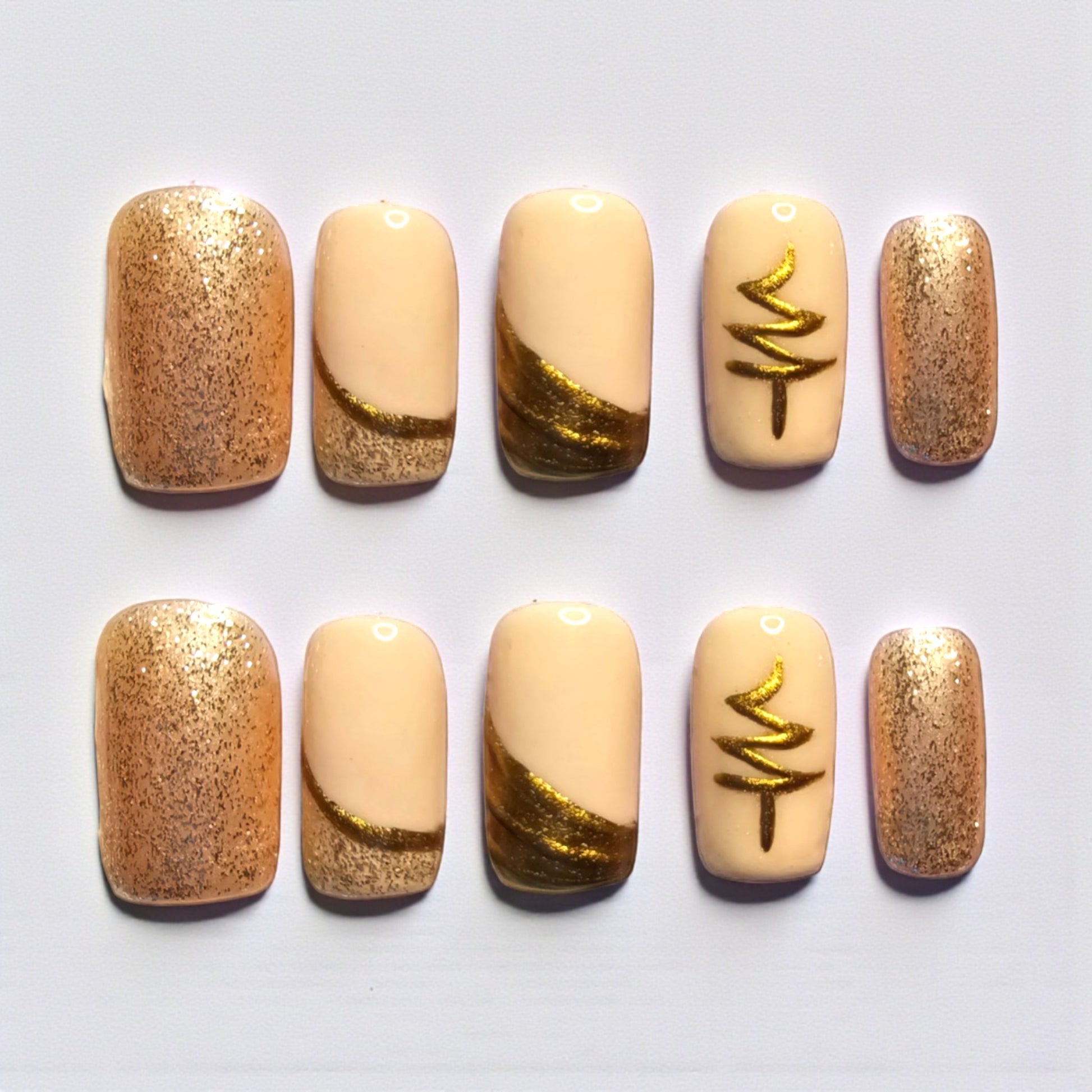 Dipped in golden glam with a kiss of nude sophistication, these press-ons were born to dazzle. Each nail flaunts a unique design—from sparkly gold gradients that shimmer like sunshine on honey to bold accents that say “I woke up flawless.” They’re not just pretty faces either: comfy, durable, and made to last through dance-offs, deep thoughts, and texting your bestie at 2 AM. Perfect for anyone who wants luxe nails without the salon hustle, these beauties are your shortcut to instant glow-up status. Auntie Cookie’s got you covered—now go ahead and flex those fingertips like you mean it.