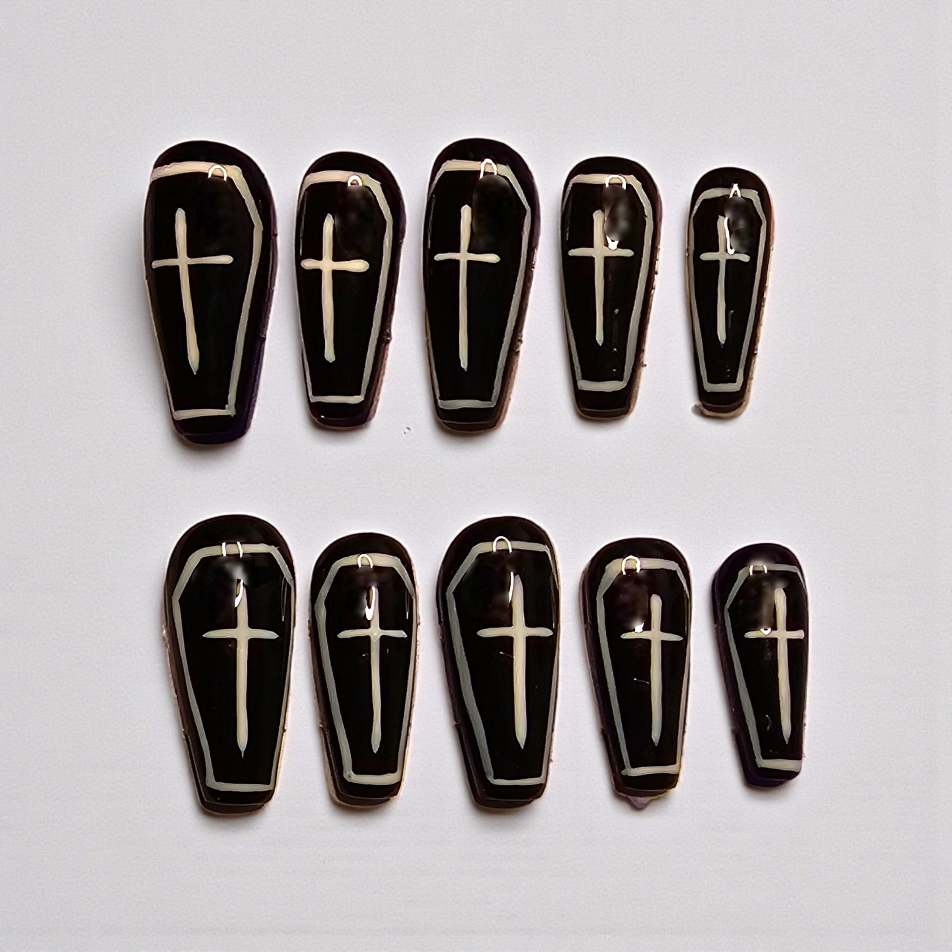 Your Eternal Rest Press On Nails embody a sophisticated take on dark, macabre elegance. Featuring sleek coffin shapes and deep, shadowy tones, these nails evoke a hauntingly refined aesthetic that balances spooky allure with timeless style. Perfect for those who appreciate bold, mysterious beauty with a polished edge.
