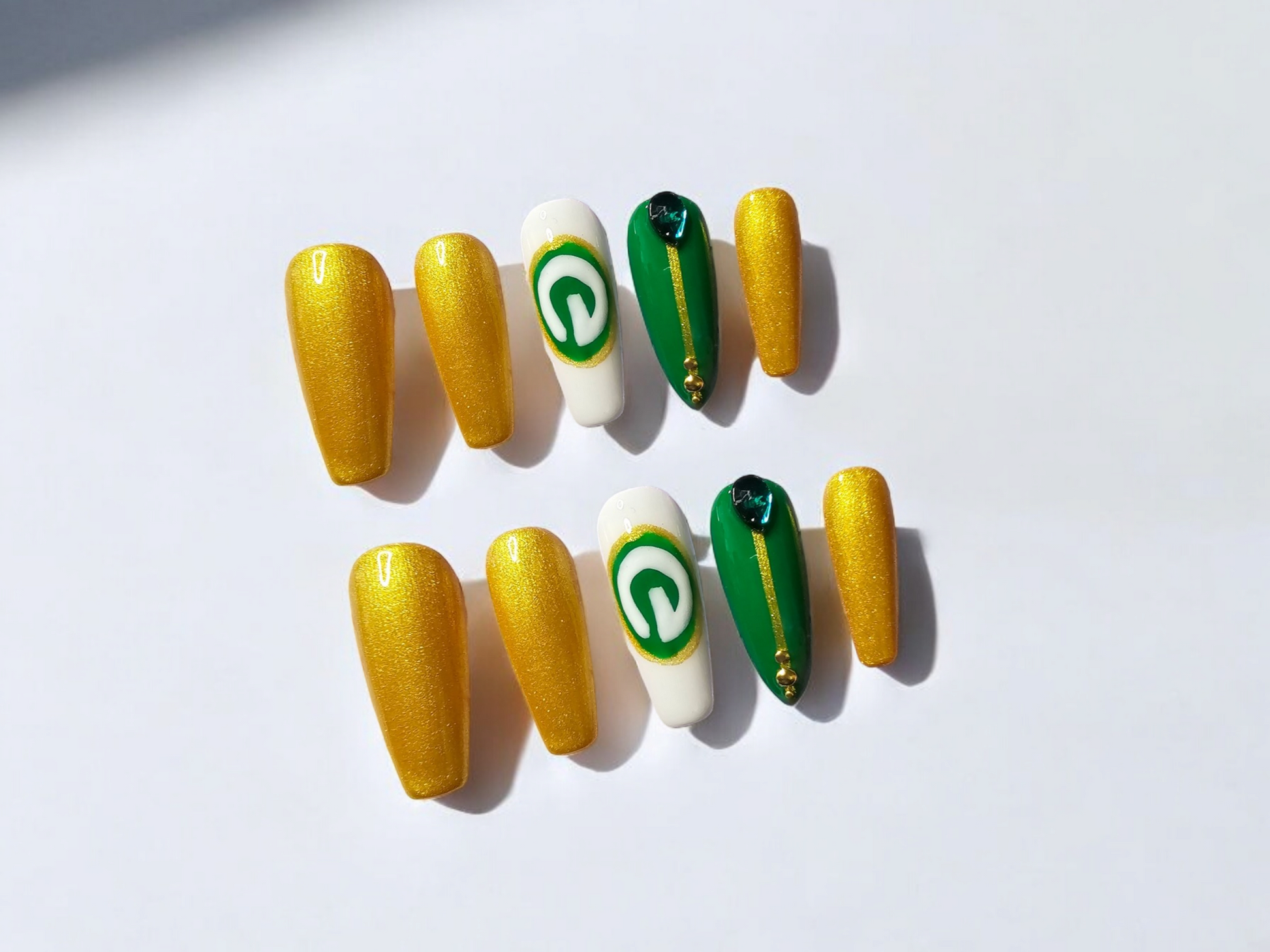 Get ready to glam up your game day with our Touchdown Tips nail set, inspired by the iconic green and gold that fans know and love. These press-ons are perfect for anyone repping Wisconsin football pride without crossing the copyright line. With emerald shimmer, golden glam, and crisp white details that nod to team spirit, this set brings that winning energy to every outfit. Whether you're tailgating, hosting a watch party, or just vibing with sporty style, these nails are your secret weapon for touchdown-worthy tips. Easy to apply, long-lasting, and totally fan-approved, they’ll carry you from kickoff to final whistle in full style mode.