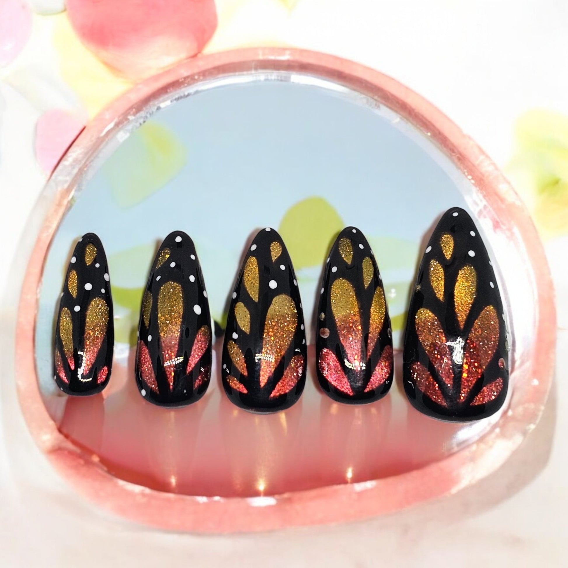 These press-on nails feature a stunning butterfly wing design, perfect for making a bold and whimsical statement. Each nail is painted with a shimmering cat eye glitter base that transitions from golden to a rich burnt orange. Overlaid with intricate black detailing, the design mimics the delicate structure of butterfly wings, accented by tiny white dots that enhance the realistic yet magical effect. The high-gloss finish adds a polished touch, making these nails ideal for anyone looking to express their creative and nature-inspired style.