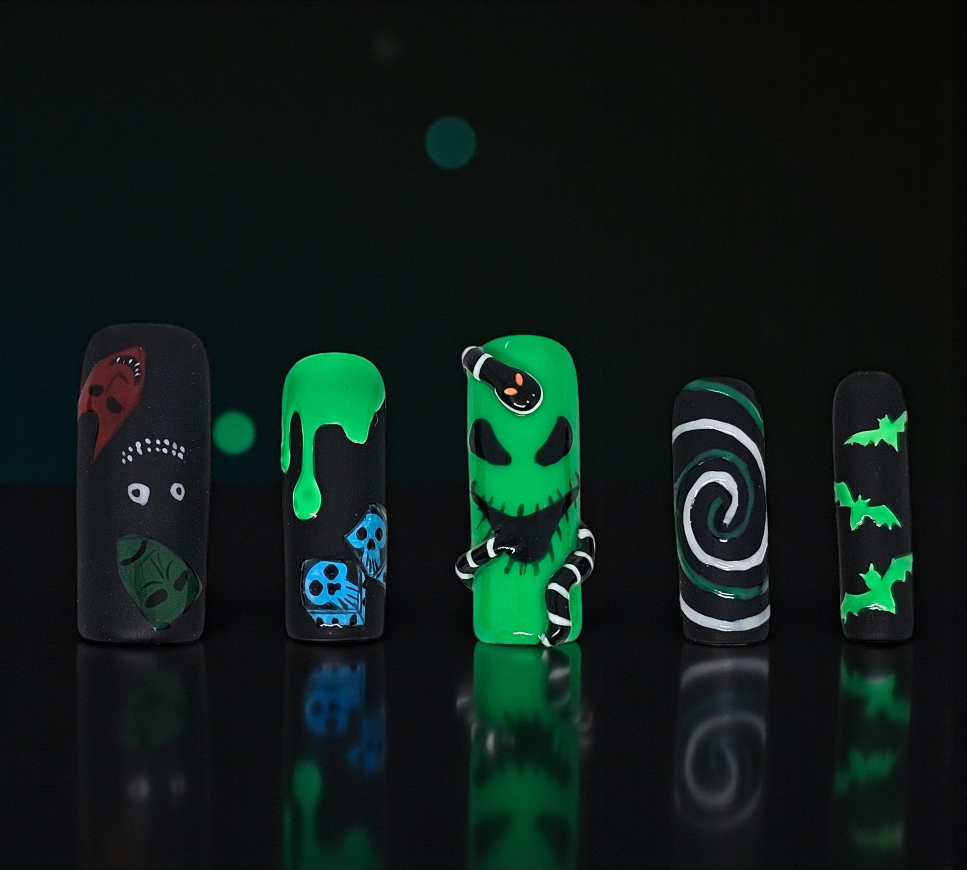 Step into the spooky-chic world of Tim Burton's beloved classic with these enchanting Nightmare Before Christmas press-on nails. Featuring iconic characters and haunting designs that glow in the dark, these nails bring a touch of gothic glamour to your fingertips. Perfect for Halloween enthusiasts, Burton fans, or anyone who loves a little eerie elegance. Each set delivers salon-quality wear with easy application and removal. Embrace your inner Pumpkin King—your nails are ready for the nightmare.
