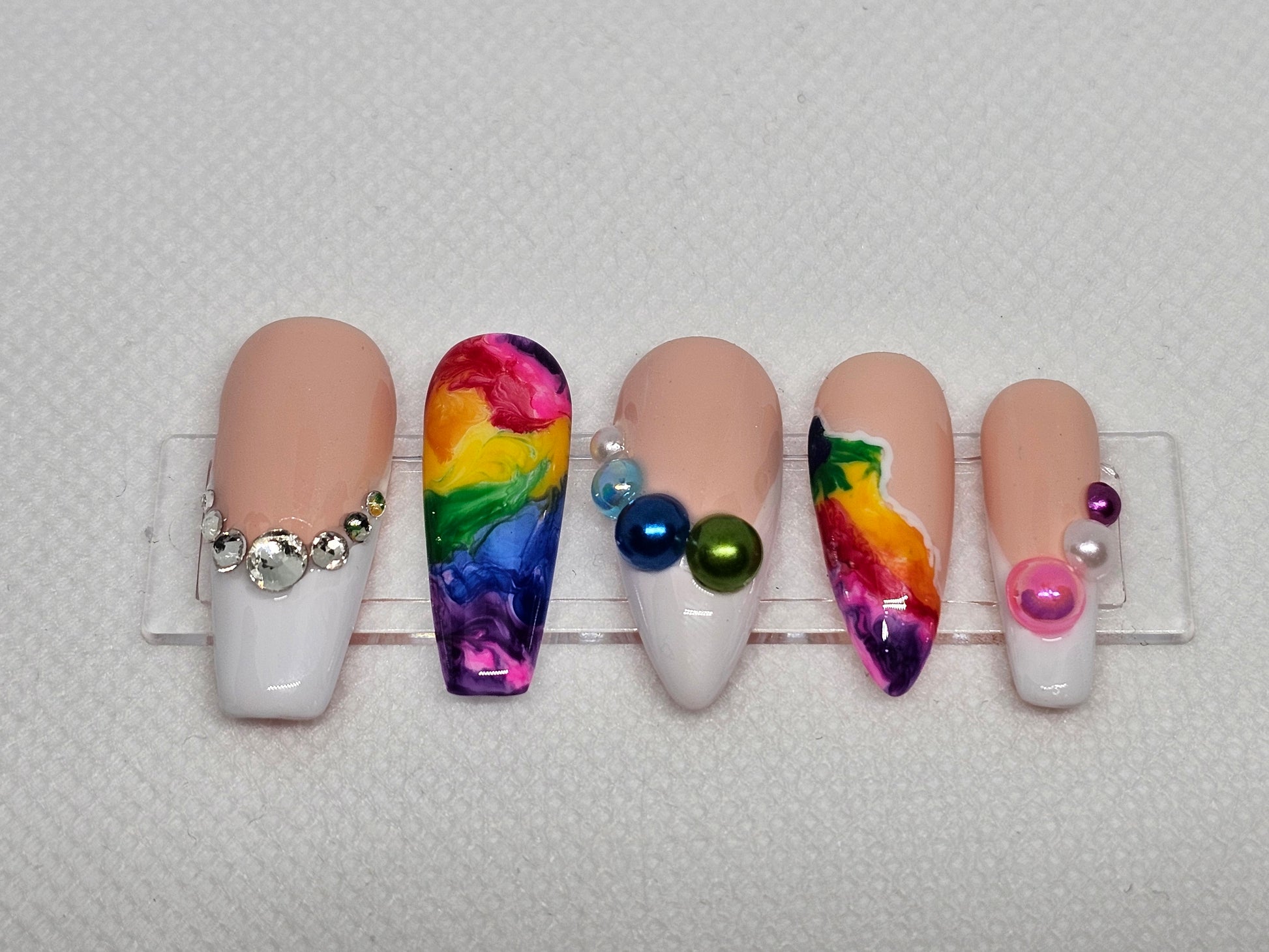 Add a pop of color to your style with our Rainbow Press-On Nails! Featuring a stunning gradient of vibrant hues, these nails are perfect for making a bold statement without the hassle of a salon visit. Perfect for pride events, festivals, parties, or everyday glam, these rainbow nails will instantly elevate your look.