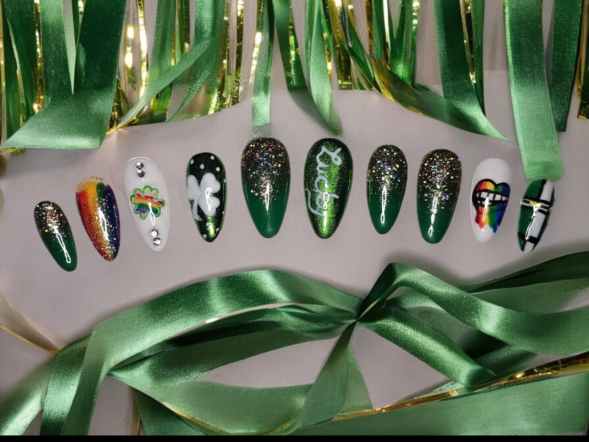Enhance your fingertips with a touch of Irish charm and elegance with our Shamrock Bliss press-on nails. These delightful nails are perfect for adding a bit of luck and style to any occasion, whether you're celebrating St. Patrick's Day or want to showcase your love for all things green. The vibrant green shamrock designs are beautifully accented with glitter and gold details, creating a mesmerizing look that will catch everyone's eye.