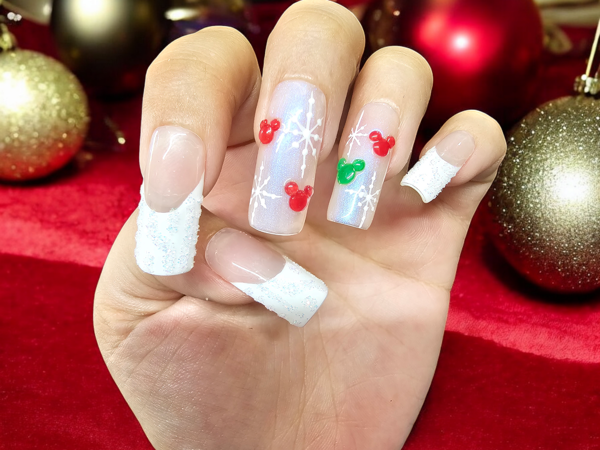 Step into a snow-globe fantasy, our merry little mani that blends seasonal sparkle with a touch of mouse-eared nostalgia. Picture red bows, glittery greens, and snowflake shimmer, all dancing across your fingertips like something you'd wear to a certain enchanted theme park. The design hints at those cheerful ears, winter joy, and feel-good childhood charm—without ever saying a name.