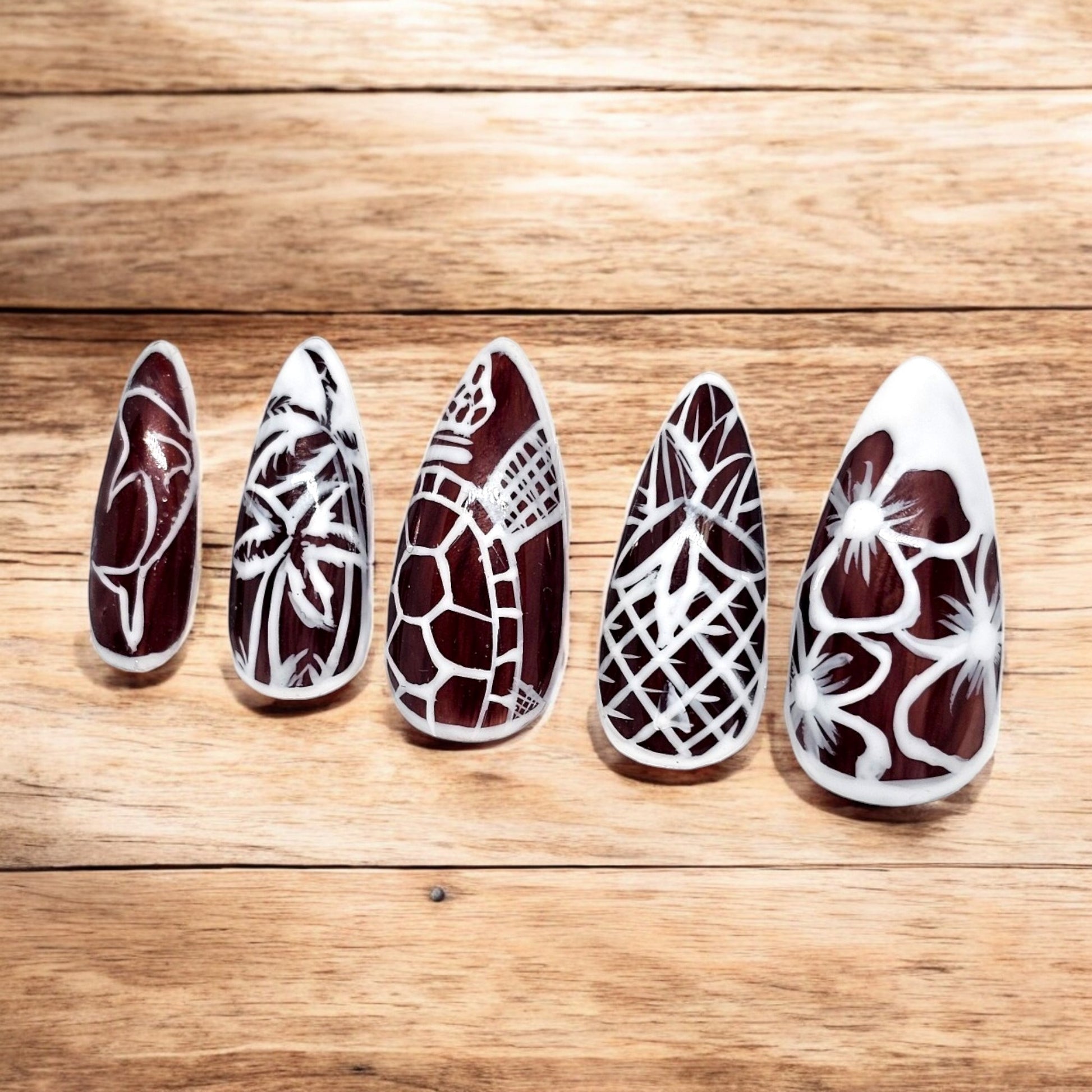 Transport your fingertips to paradise with these stunning Tropical Vibes Press-On Nails. Each nail is a miniature canvas, hand-painted in rich chocolate brown and crisp white, featuring intricate island-inspired designs — from blooming hibiscus flowers and geometric tribal patterns to a majestic sea turtle, graceful palm trees, and ocean waves.