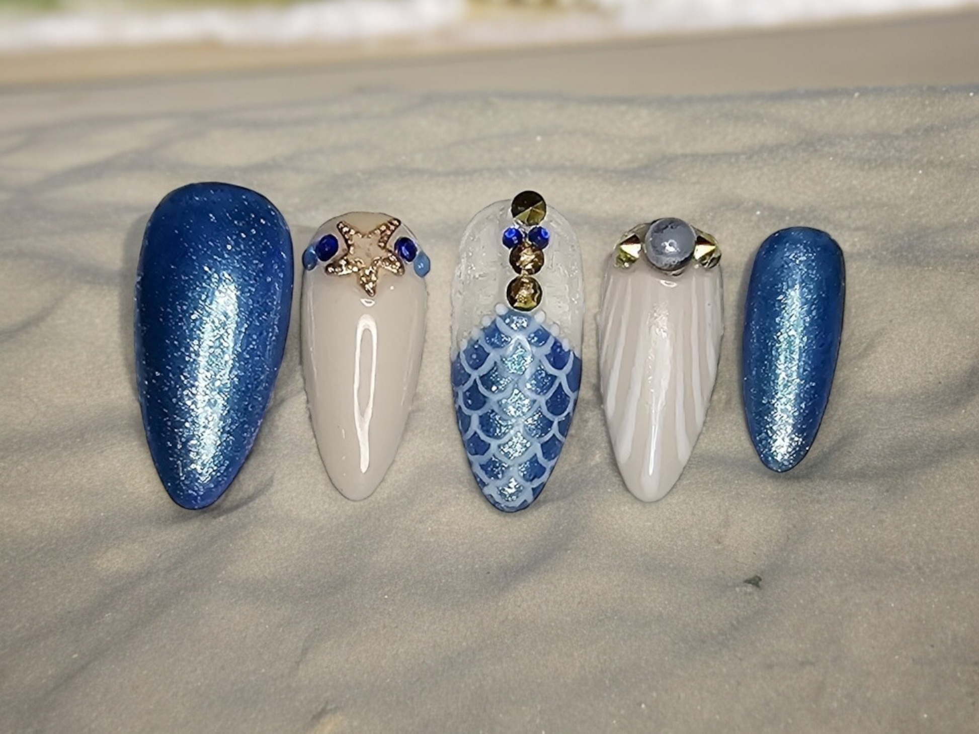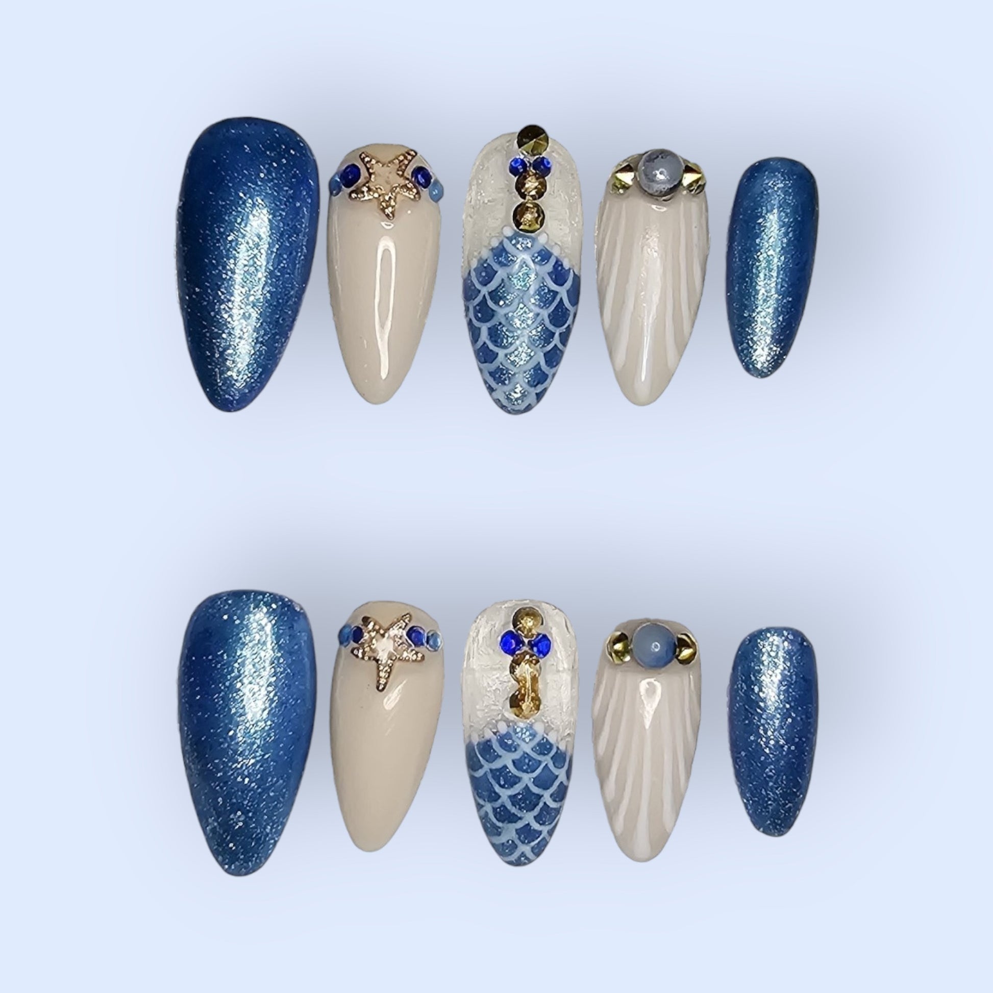 Dive into fun with Mermaid Shores Press On Nails, featuring playful starfish designs and vibrant beachy colors. Perfect for poolside vibes or seaside adventures, these nails add a splash of ocean-inspired charm to your look with a lighthearted, carefree spirit.